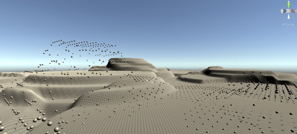 The grid of spheres is now perfectly aligned on the y-axis according to the terrain height. With this I can start part two of the TerrainGridder : Taking a mesh and changing the height of its vertices to the height of the terrain.